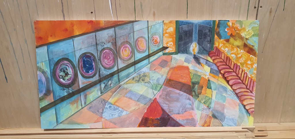 This painting is based on a childhood memory of visiting the local launderette close to where I lived. It had a kind of sci-fi vibe with weird sounds and smells. There was a doorway into another section that seeemed very mysterious – scary but intriguing. I was darker and quiter in there and it felt like I was walking into another dimension.